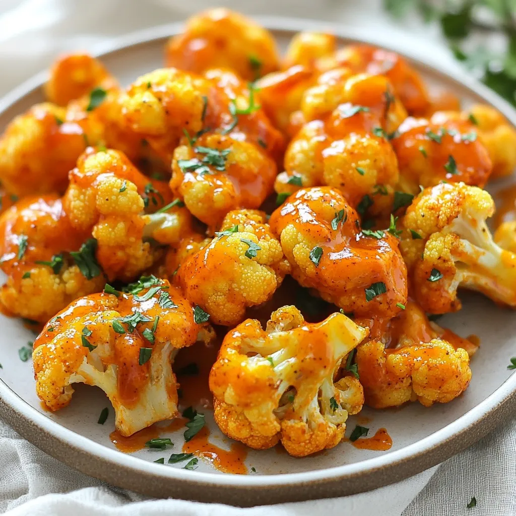 Knusprige Blumenkohlhäppchen mit würziger Buffalo-Sauce, perfekt für einen Snack oder als Vorspeise.