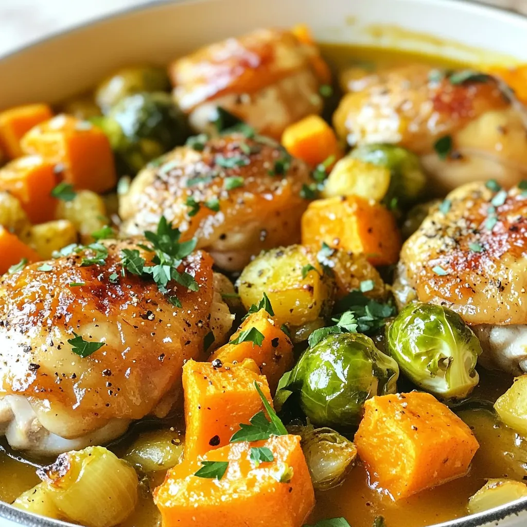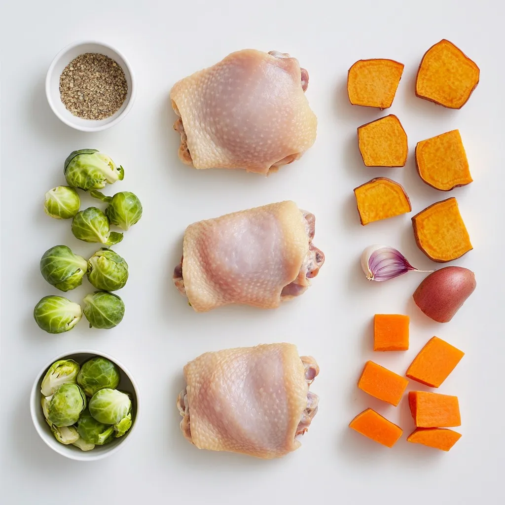 Ich liebe die einfachen und frischen Zutaten in diesem Rezept. Die Hähnchenschenkel sind saftig und zart. Das Olivenöl gibt dem Gericht einen tollen Geschmack. Die Zwiebel sorgt für einen süßen, angenehmen Duft. Karotten und Süßkartoffeln fügen Farbe und Süße hinzu. Rosenkohl bringt eine knackige Textur, die perfekt passt.