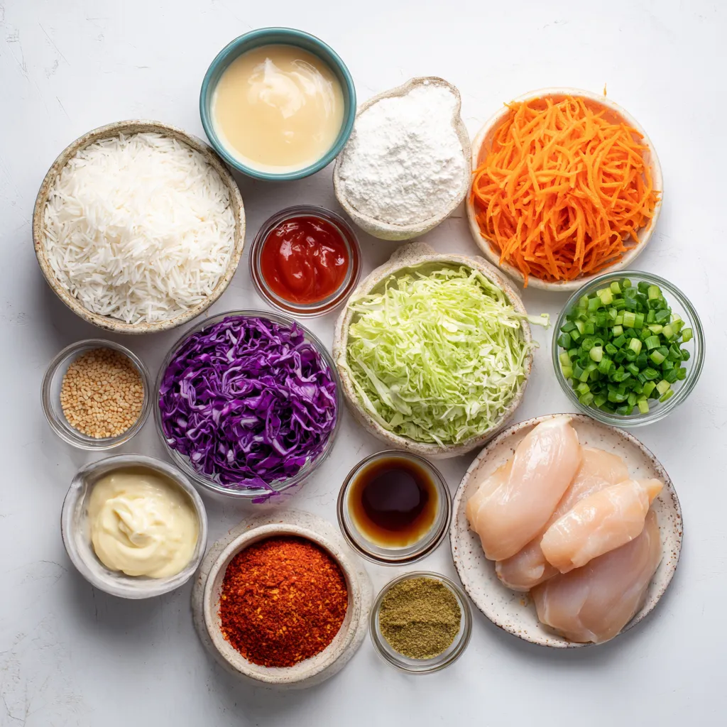 Die Hauptzutaten sind einfach, aber sehr wichtig. Die Hähnchenbrustfilets sind das Herzstück des Gerichts. Sie sind zart und lassen sich gut würzen. Die Speisestärke sorgt für die perfekte Knusprigkeit. Die Gewürze wie Knoblauchpulver, Zwiebelpulver und Paprika bringen tollen Geschmack. Die Bang Bang Sauce aus Mayonnaise, süßer Chilisauce und Sriracha gibt dem Gericht die richtige Würze.