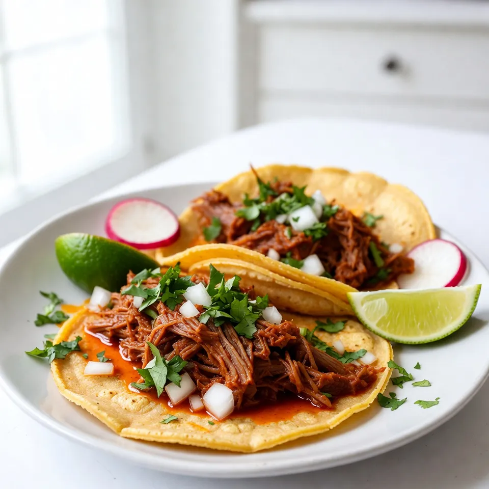 Tacos zusammenstellen: Fülle jede Tortilla großzügig mit zerkleinertem Rindfleisch. Belege die Tacos mit gehackten Zwiebeln und frischem Koriander, und serviere sie mit Limettenschnitzen an der Seite.