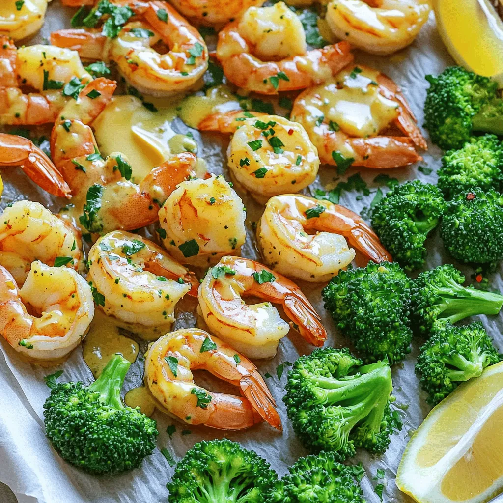 Legen Sie die Brokkoliröschen auf die eine Hälfte des Backblechs. Träufeln Sie die Hälfte der Knoblauchbutter-Mischung darüber. Rühren Sie sanft, damit der Brokkoli gleichmäßig benetzt wird. Auf der anderen Hälfte des Backblechs ordnen Sie die Garnelen in einer einzigen Schicht an. Verteilen Sie die restliche Knoblauchbutter-Mischung gleichmäßig über die Garnelen. Rühren Sie gut um, damit sie schön bedeckt sind. Backen Sie alles im vorgeheizten Ofen für 12 bis 15 Minuten. Die Garnelen sollten rosa und opak sein. Der Brokkoli wird zart und leicht knusprig. Nehmen Sie das Blech heraus und bestreuen Sie alles mit gehackter Petersilie. Servieren Sie sofort mit Zitronenspalten für einen frischen Geschmack.