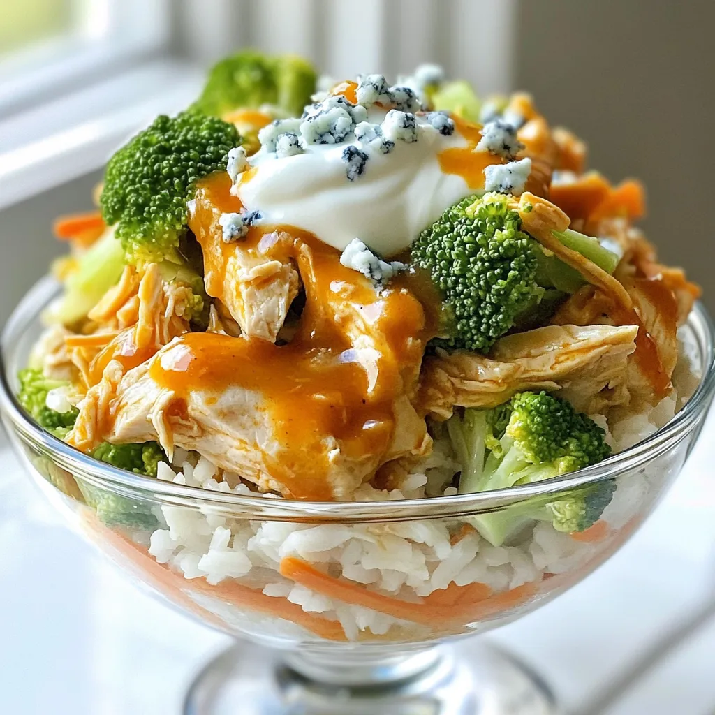 Servieren Sie die Bowls in klaren Glasbehältern für einen ansprechenden, geschichteten Look. Für zusätzlichen Pfiff und Schärfe einen Spritzer weiterer Buffalo-Sauce obendrauf geben!