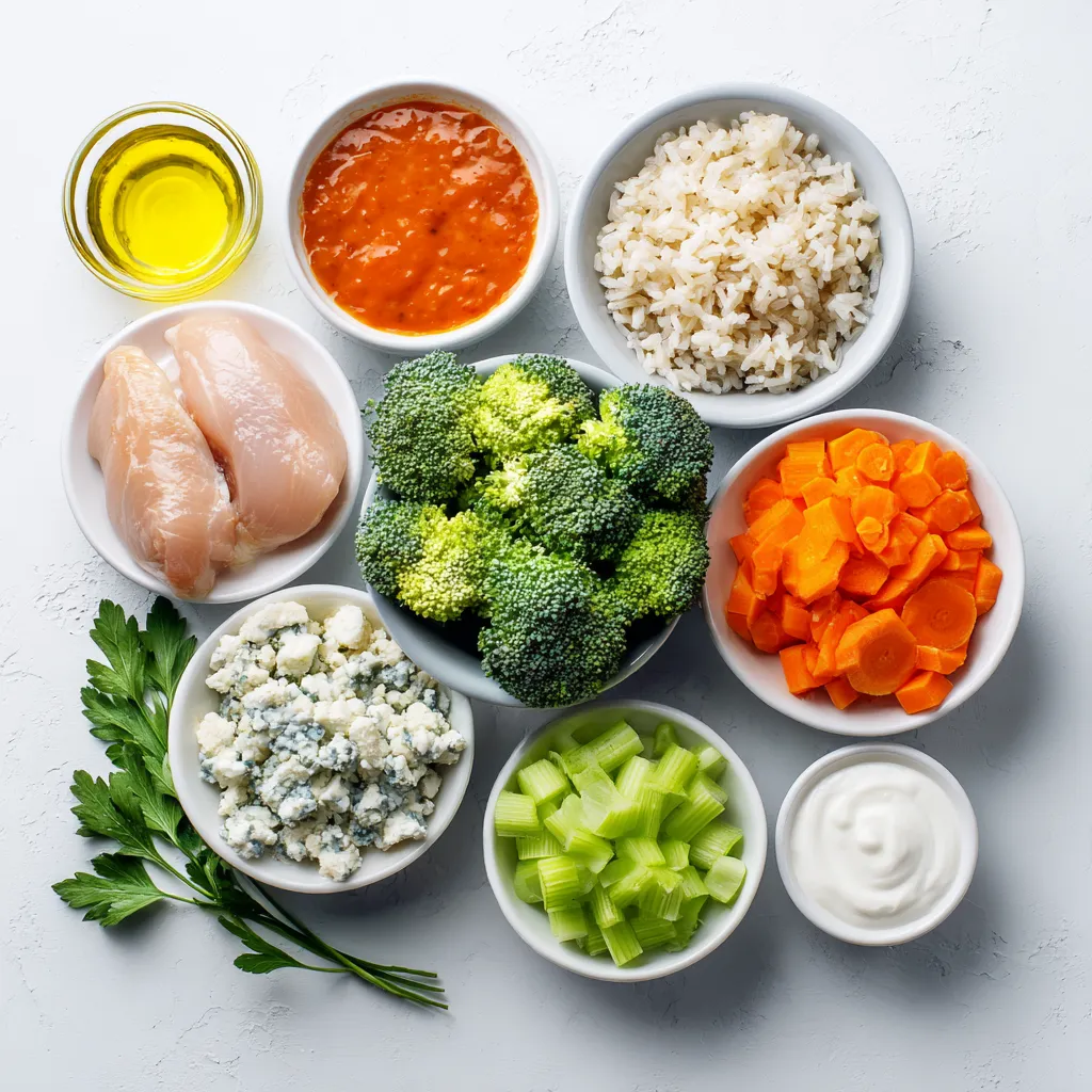 In einer Schüssel den Reis als Basis platzieren. Darauf die gedämpften Brokkoliröschen, die geriebenen Karotten, gewürfelten Sellerie und die Buffalo-Hähnchen-Mischung schichten.