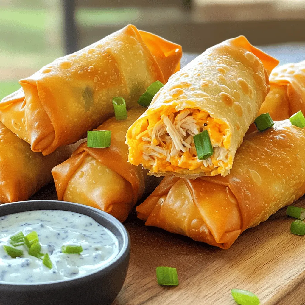 Buffalo Chicken Egg Rolls schmecken am besten mit Dips. Ich empfehle Blauschimmelkäse- oder Ranch-Dressing. Diese Dips ergänzen den würzigen Geschmack. Du kannst auch frische Gemüsesticks wie Karotten oder Sellerie dazu servieren. Das gibt einen schönen Crunch und sorgt für Abwechslung. Wenn du Gäste hast, richte die Frühlingsrollen auf einem großen Teller an. Füge die Dips in kleinen Schalen hinzu. So sieht es einladend aus und jeder kann nach Belieben dippen.