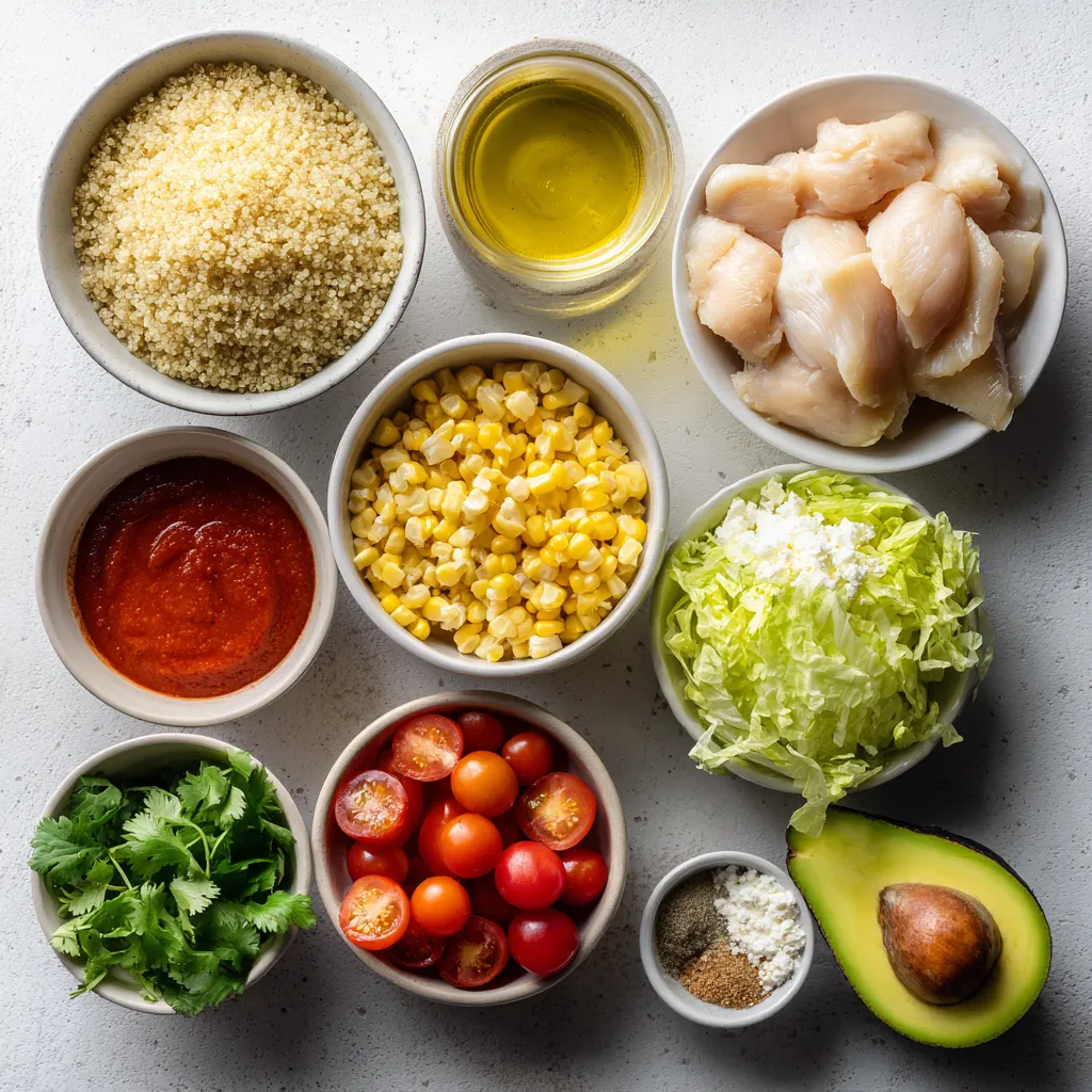 Für Buffalo Chicken Power Bowls brauchen Sie einige frische und gesunde Zutaten. Hier sind die Hauptzutaten: