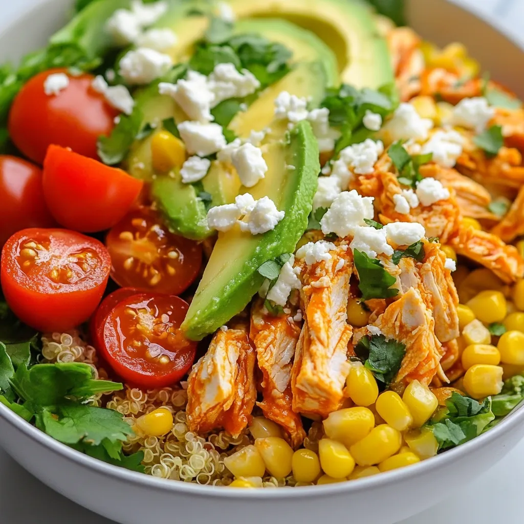 Belegen Sie den Quinoa mit dem zerrupften Buffalo-Hähnchen, Cherry-Tomaten, dem gekochten Mais, den Avocadoscheiben und dem Romana-Salat.