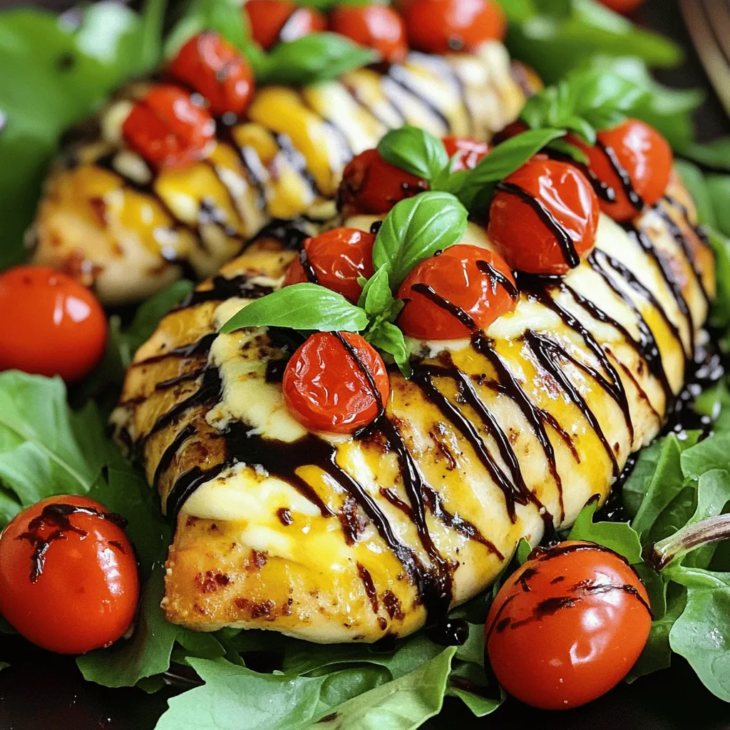 Lassen Sie das Hähnchen fünf Minuten ruhen, bevor Sie es in Scheiben schneiden. Träufeln Sie etwas Balsamico-Glasur über die Hähnchenbrüste. Servieren Sie sie auf einem Bett aus gemischtem Grün und garnieren Sie mit Basilikumblättern und Kirschtomaten.