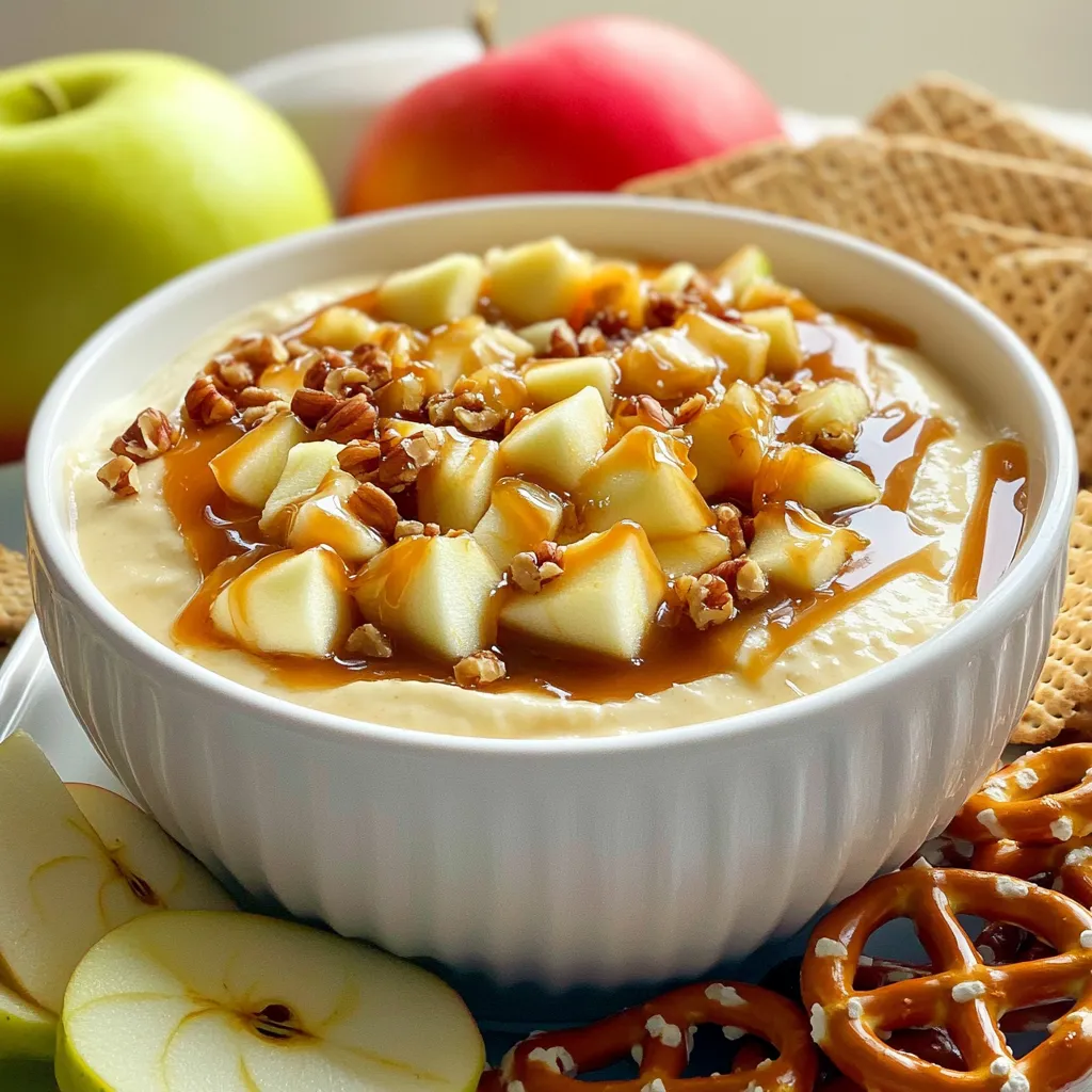 Die Präsentation macht viel aus. Nutze eine große Schüssel für den Dip. Das sieht einladend aus. Träufle die Karamellsauce in einem Muster darüber. Streue die Nüsse gleichmäßig, damit jeder einen Crunch erhält. Serviere den Dip mit bunten Äpfeln und knusprigen Graham-Crackern. Das sorgt für einen schönen Kontrast.
