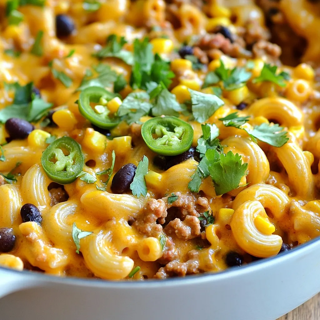 Streue das Taco-Gewürz über die Mischung. Rühre gut um, damit es gleichmäßig verteilt wird. Jetzt kommen die Ellbogen-Makkaroni, schwarzen Bohnen, Mais, gewürfelte Tomaten und Hühnerbrühe dazu. Mische alles gründlich. Bringe die Mischung zum Kochen. Reduziere dann die Hitze auf niedrig. Decke die Pfanne ab und lasse alles 12-15 Minuten köcheln. Rühre gelegentlich um. Wenn die Pasta al dente ist, nimm die Pfanne vom Herd. Füge den geriebenen Cheddar-Käse und Sauerrahm hinzu. Rühre, bis alles schön cremig ist. Schmecke mit Salz und Pfeffer ab. Garniere das Gericht mit frischem Koriander und Jalapeños, wenn gewünscht.