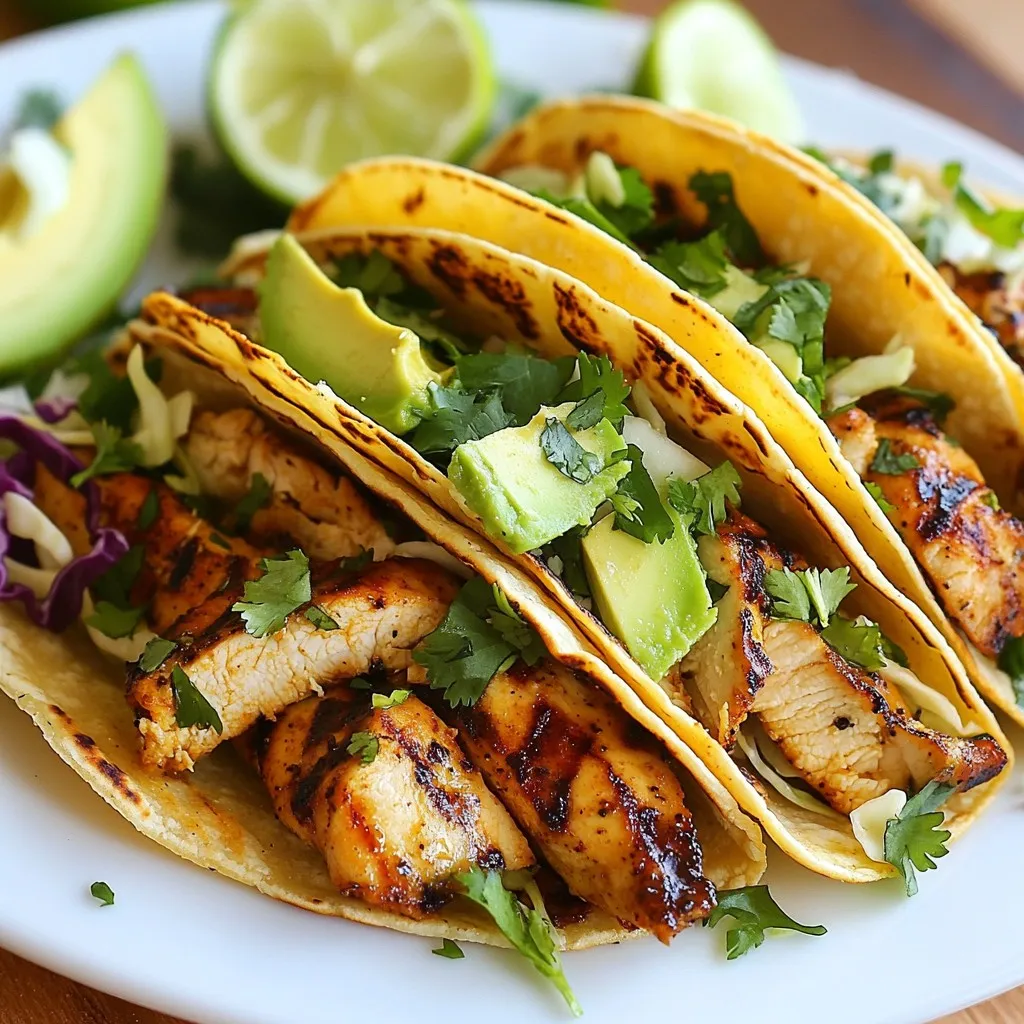 Leckere Tacos mit gegrilltem Hähnchen, mariniert in einer würzigen Chili-Limetten-Marinade.