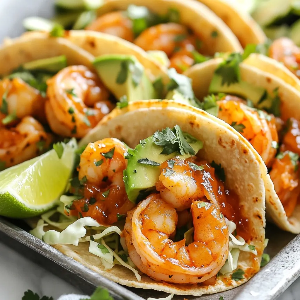 Leckere Tacos mit marinierten Garnelen, Limette und frischen Zutaten.