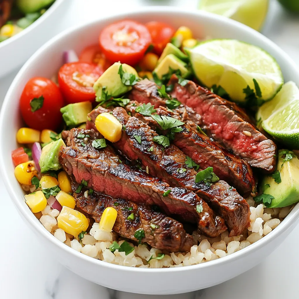 Eine schöne Bowl macht das Essen noch besser. Beginne mit einer Schicht braunem Reis als Basis. Ordne die Steakstreifen darauf an. Füge dann die Kirschtomaten, Avocado, Mais und Zwiebel dekorativ hinzu. Nutze verschiedene Farben für mehr Vielfalt. Ein Spritzer Limettensaft über alles gibt den letzten Schliff. Serviere die Bowls mit frischen Limettenstücken an der Seite. So sieht jedes Gericht toll aus und schmeckt noch besser.