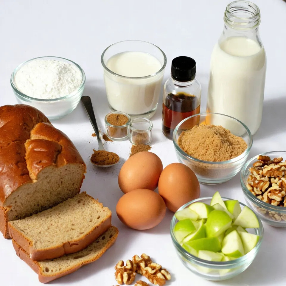 Die Hauptzutaten sind einfach, aber wichtig. Dicke Brotscheiben geben dem Gericht eine tolle Textur. Brioche oder Challah sind perfekt, weil sie weich und süß sind. Äpfel bringen Frische und einen tollen Geschmack. Granny Smith sorgt für eine schöne Säure, während Honeycrisp süß und knackig ist. Eier und Milch sorgen für die cremige Basis.