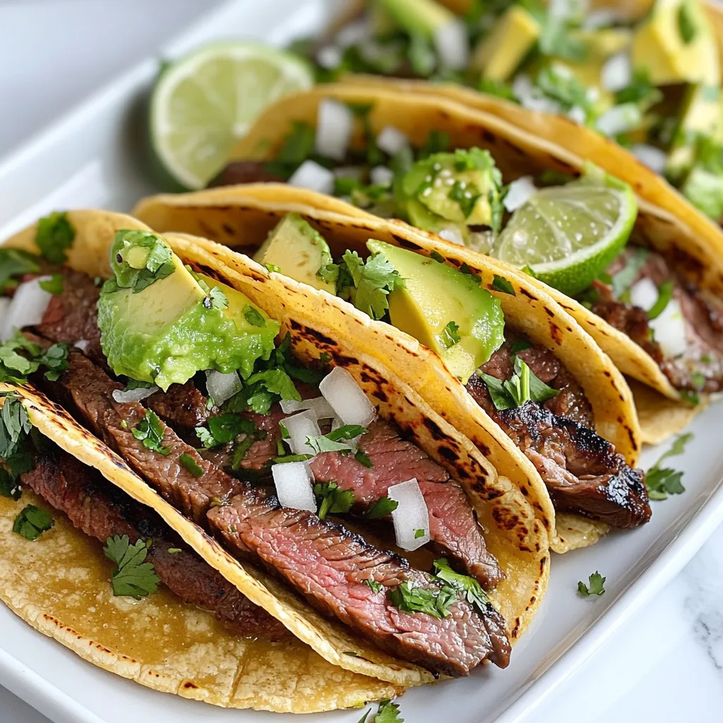Schneiden und servieren: Das Steak dünn gegen die Faser aufschneiden und in warme Maistortillas servieren. Mit gewürfelten Zwiebeln, gehacktem Koriander, Avocadoscheiben und Limettenvierteln garnieren.