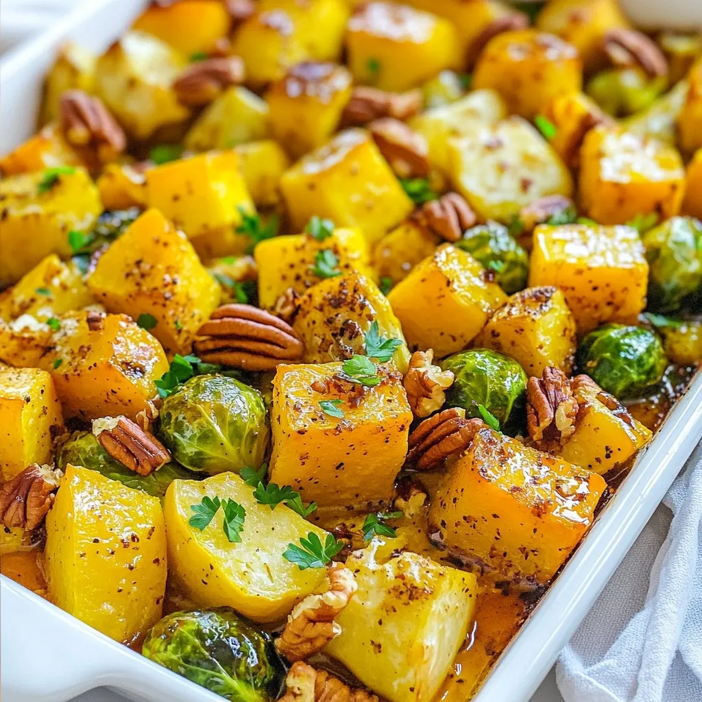 Ein herbstliches Gericht mit gewürztem Butternut-Kürbis und Rosenkohl, perfekt für die kühle Jahreszeit.