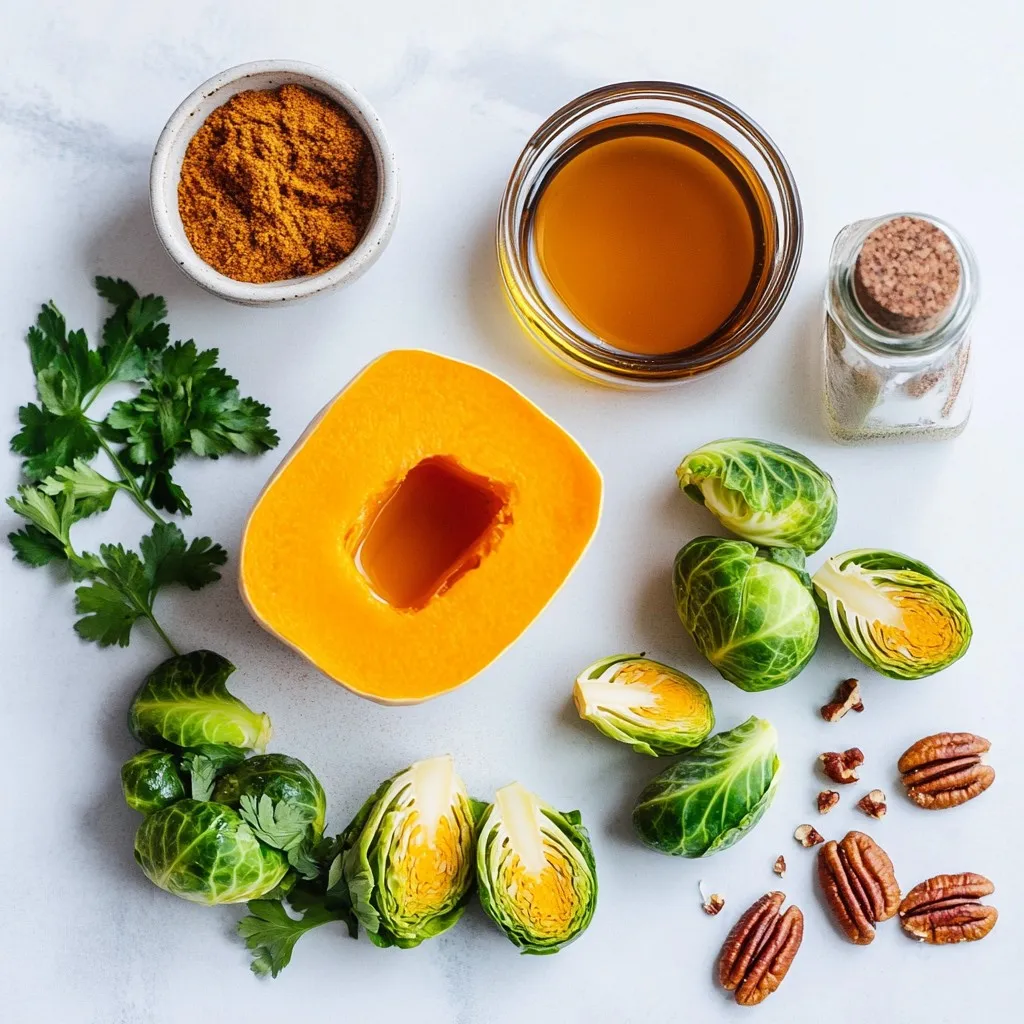 Die Hauptzutaten sind einfach und frisch. Der Butternut-Kürbis bringt eine süße Note. Rosenkohl sorgt für einen tollen Crunch und eine bittere Tiefe. Gewürze wie Zimt und Muskatnuss geben dem Gericht Wärme. Das Olivenöl hilft, alles zu verbinden und die Aromen freizusetzen.