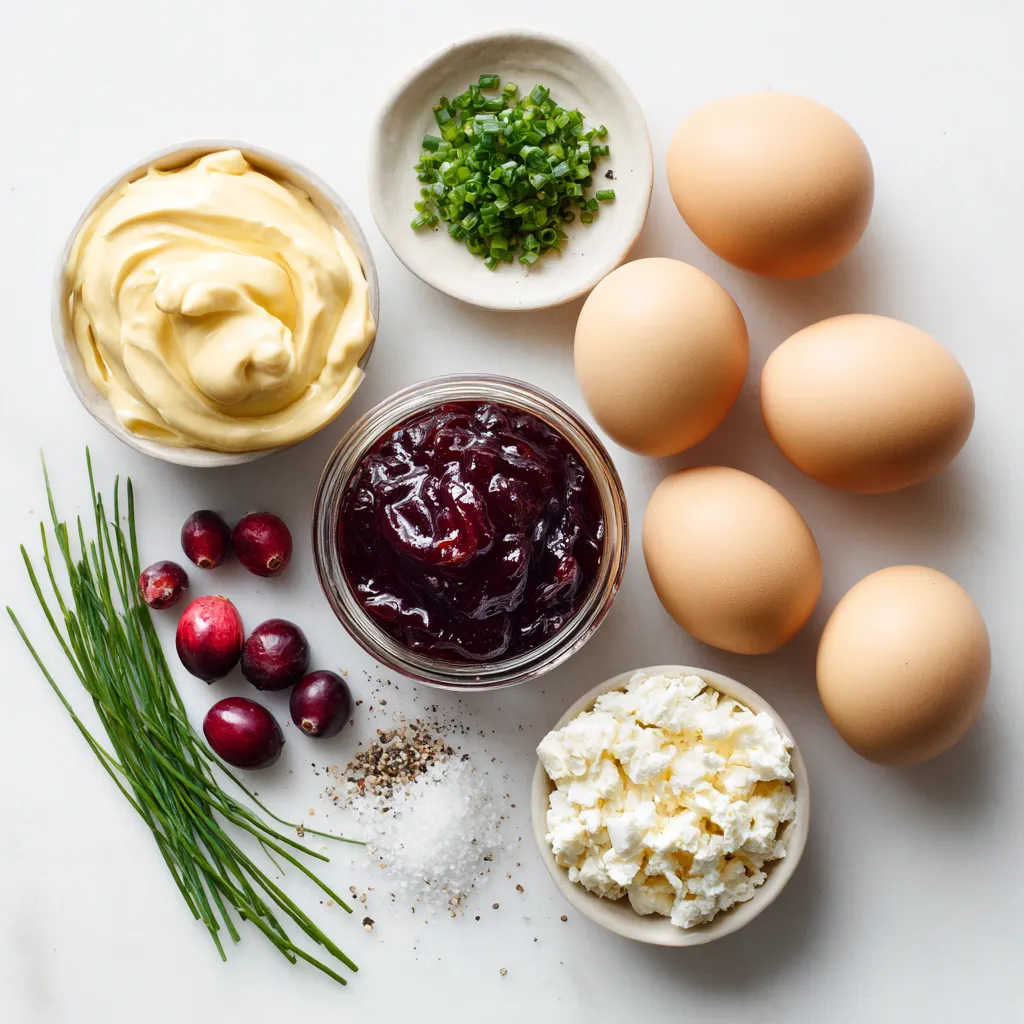 Die Hauptzutaten für Cranberry Deviled Eggs sind einfach zu finden. Frische Eier sind der Schlüssel. Sie sorgen für eine zarte Textur. Die Mayonnaise macht die Füllung cremig. Dijon-Senf gibt einen kleinen Kick. Cranberry-Sauce verleiht einen fruchtigen Geschmack. Schnittlauch bringt Frische und Farbe. Feta-Käse ist optional, aber sehr lecker.