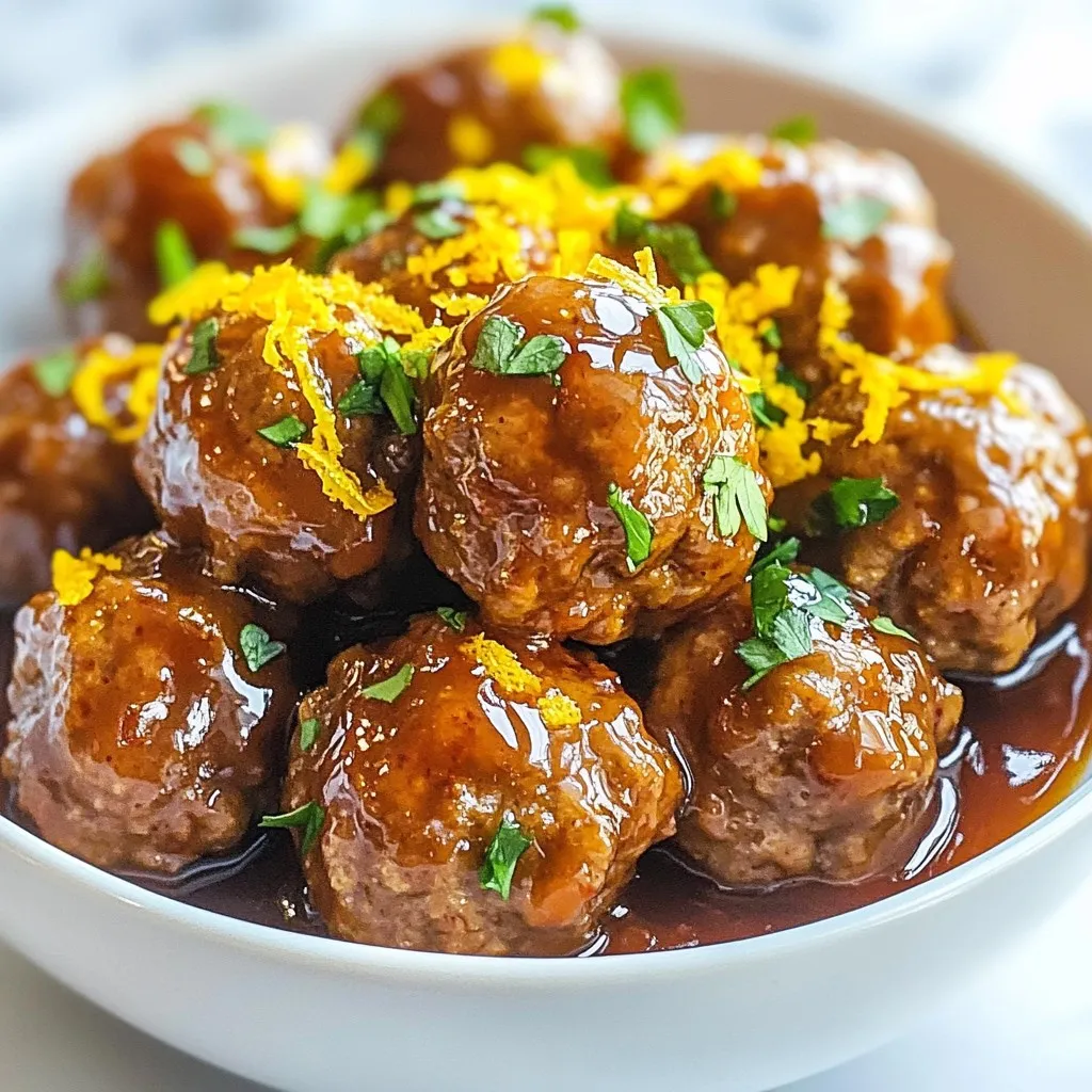 Servieren Sie die Fleischbällchen auf einem Holztablett oder in einer dekorativen Schüssel, beträufelt mit zusätzlicher Glasur und bestreut mit zusätzlicher Orangenschale für eine lebendige Präsentation.