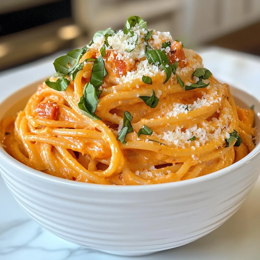 Servieren: Richten Sie die cremige Pasta mit gerösteten roten Paprika auf Tellern an und garnieren Sie sie mit frisch gehacktem Basilikum und, falls gewünscht, zusätzlichem geriebenem Parmesan.