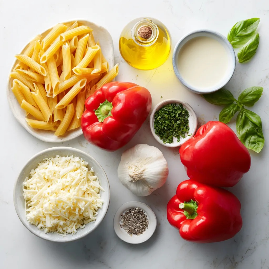 Die Hauptzutaten sind einfach und lecker. Du kannst Penne oder Fusilli verwenden. Beide Formen halten die Sauce gut fest. Rote Paprika bringt Süße und Farbe. Schlagsahne macht die Sauce cremig und reichhaltig. Parmesan gibt der Pasta einen herzhaften Geschmack.