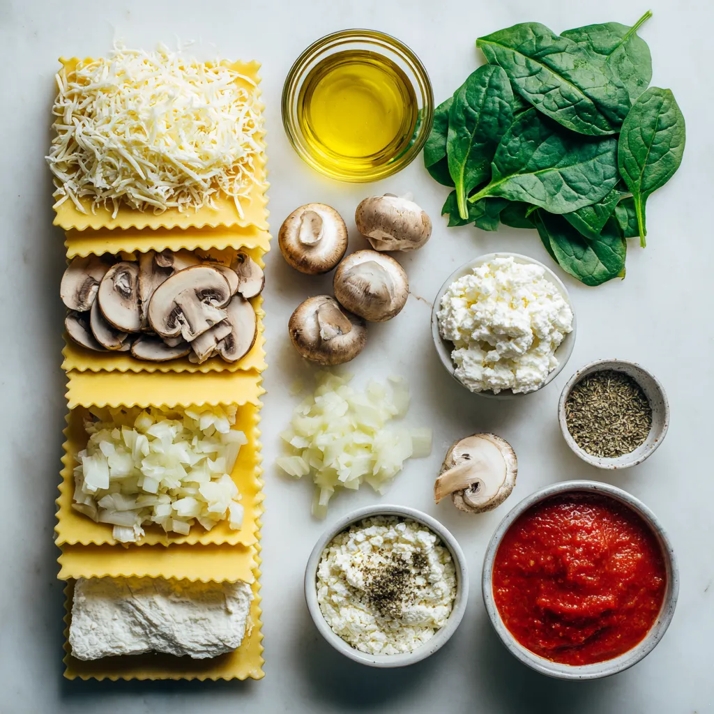 Hauptzutaten für die cremige Spinat-Pilz-Lasagne