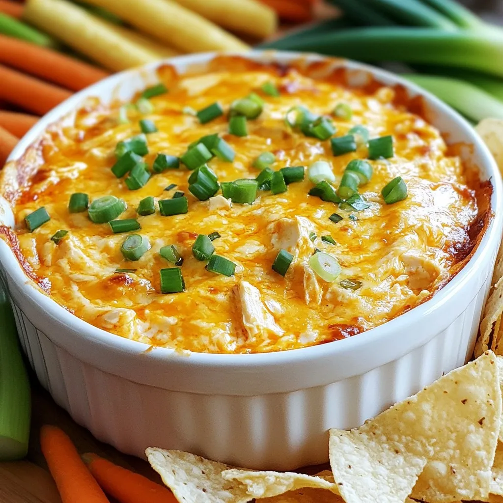 Serviere den Dip warm für das beste Erlebnis. Verwende Tortillachips, Selleriestangen oder Karottensticks zum Dippen. Diese Optionen bieten eine schöne Textur und einen tollen Kontrast. Garnieren mit gehackten Frühlingszwiebeln macht das Gericht bunt und ansprechend. Du kannst auch Blauschimmelkäse-Stücke oben drauf geben. So erhältst du mehr Geschmack und eine besondere Note.