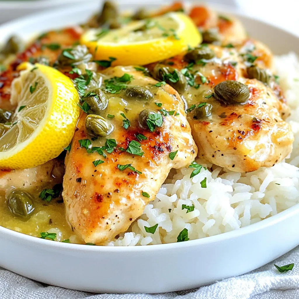 Serviere das Hühnchen Piccata auf einem Bett aus gekochter Pasta oder Reis und garniere mit Zitronenscheiben und frischer Petersilie.