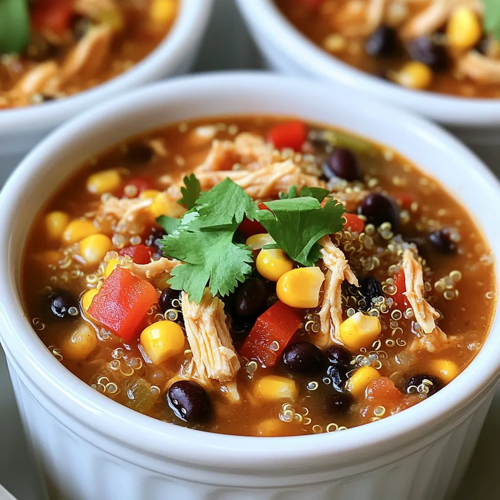 Jetzt richten Sie das Hähnchen an. Gießen Sie 240 ml kaltes, natriumreduziertes Hühnerbrühe über das Hähnchen. Diese Brühe hält das Hähnchen saftig. In einer großen Schüssel mischen Sie die schwarzen Bohnen, die Quinoa, die gewürfelte Paprika, den Mais und die Zwiebel. Vergessen Sie nicht den zerdrückten Knoblauch, zwei Teelöffel Kreuzkümmel, einen Teelöffel geräuchertes Paprikapulver und einen Teelöffel Chilipulver. Fügen Sie Salz und Pfeffer nach Geschmack hinzu. Rühren Sie alles gut um, bis sich die Zutaten verbinden. Löffeln Sie diese Mischung vorsichtig über das Hähnchen im Crockpot. Achten Sie darauf, dass sie gleichmäßig verteilt ist.