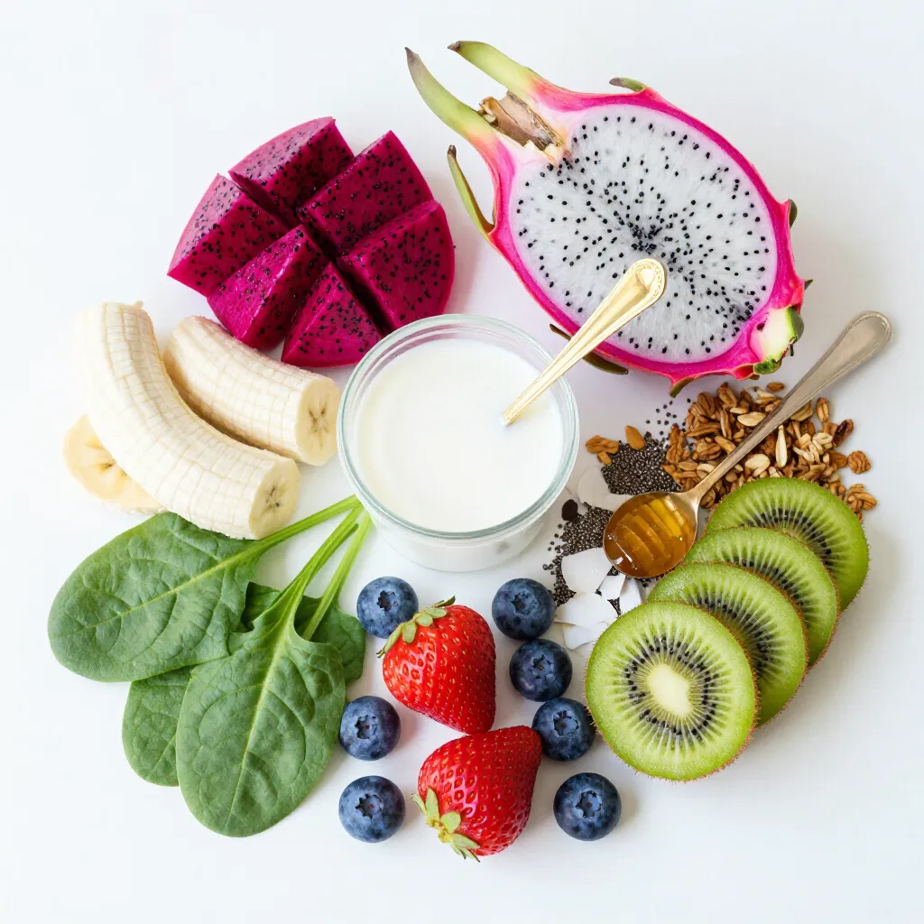 Zuerst wähle eine reife Drachenfrucht aus. Die Farbe sollte kräftig pink oder gelb sein. Schneide die Drachenfrucht in zwei Hälften und löffele das Fruchtfleisch heraus. Schneide es in kleine Stücke. Nimm dann eine gefrorene Banane. Die Banane sorgt für eine cremige Konsistenz. Bereite auch die anderen Zutaten vor: Kokosnussmilch, Honig und optional Spinat. Spinat fügt Nährstoffe hinzu, ohne den Geschmack zu verändern.