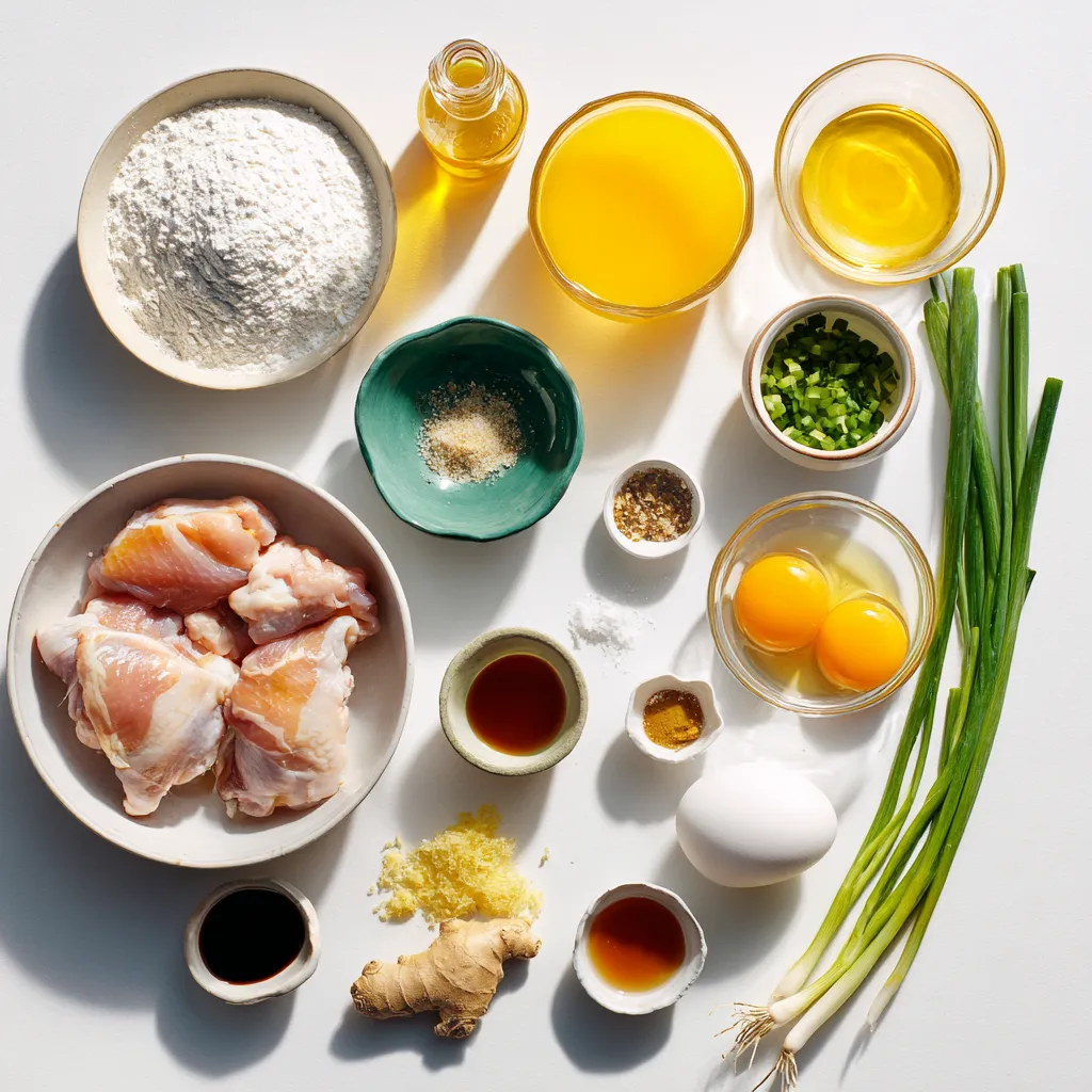 Zuerst bereiten wir die Hähnchenstücke vor. Ich nehme 450 g Hähnchenschenkel ohne Knochen und Haut. Diese schneide ich in mundgerechte Stücke. In einer mittelgroßen Schüssel mische ich die trockenen Zutaten. Das sind 240 ml Maisstärke, 120 g Weizenmehl, 1 Teelöffel Backpulver, 1/2 Teelöffel Salz und 1/4 Teelöffel schwarzer Pfeffer. Die Mischung sorgt für eine knusprige Textur. Dann tauche ich die Hähnchenstücke in 2 verquirlte Eier. Danach wälze ich sie in der Maisstärkemischung, bis sie gut bedeckt sind.