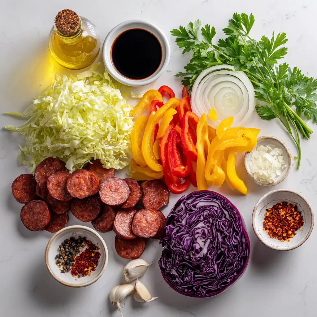 Ein herzhaftes Gericht mit geräucherter Wurst und frischem Kohl, perfekt für ein schnelles Abendessen.