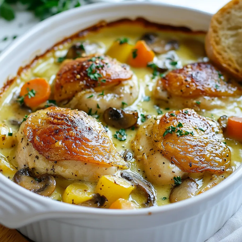 Ein herzhaftes und cremiges Hähnchenauflaufgericht mit Gemüse und Käse.