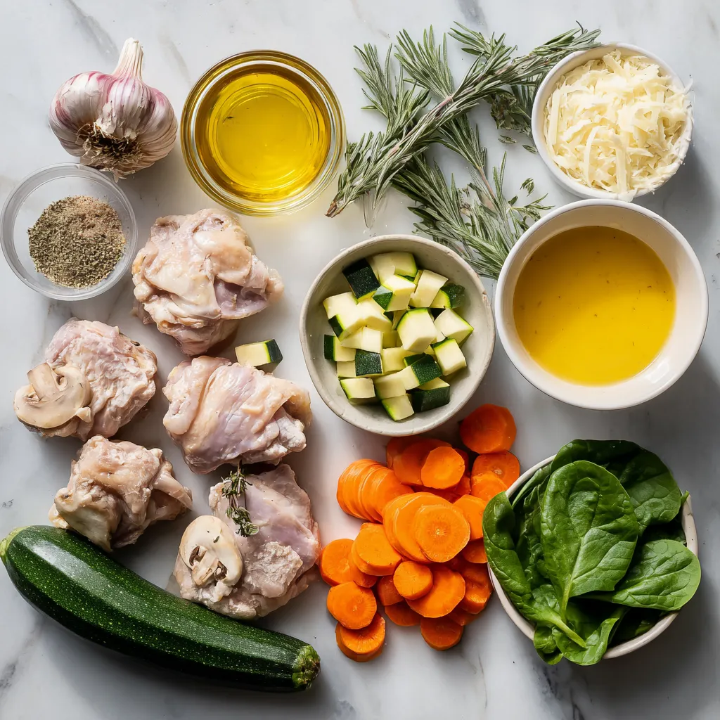 Zuerst heizen wir den Ofen auf 190°C vor. Diese Temperatur sorgt für ein gleichmäßiges Garen. Nimm die Hähnchenschenkel und schneide sie in Stücke. Das macht das Braten einfacher und schneller. Würfle die Zwiebel und hacke den Knoblauch fein. Diese Zutaten geben dem Gericht viel Geschmack. Dann schneide die Karotten, die Zucchini und die Pilze. Du brauchst sie für die leckere Gemüsebasis.