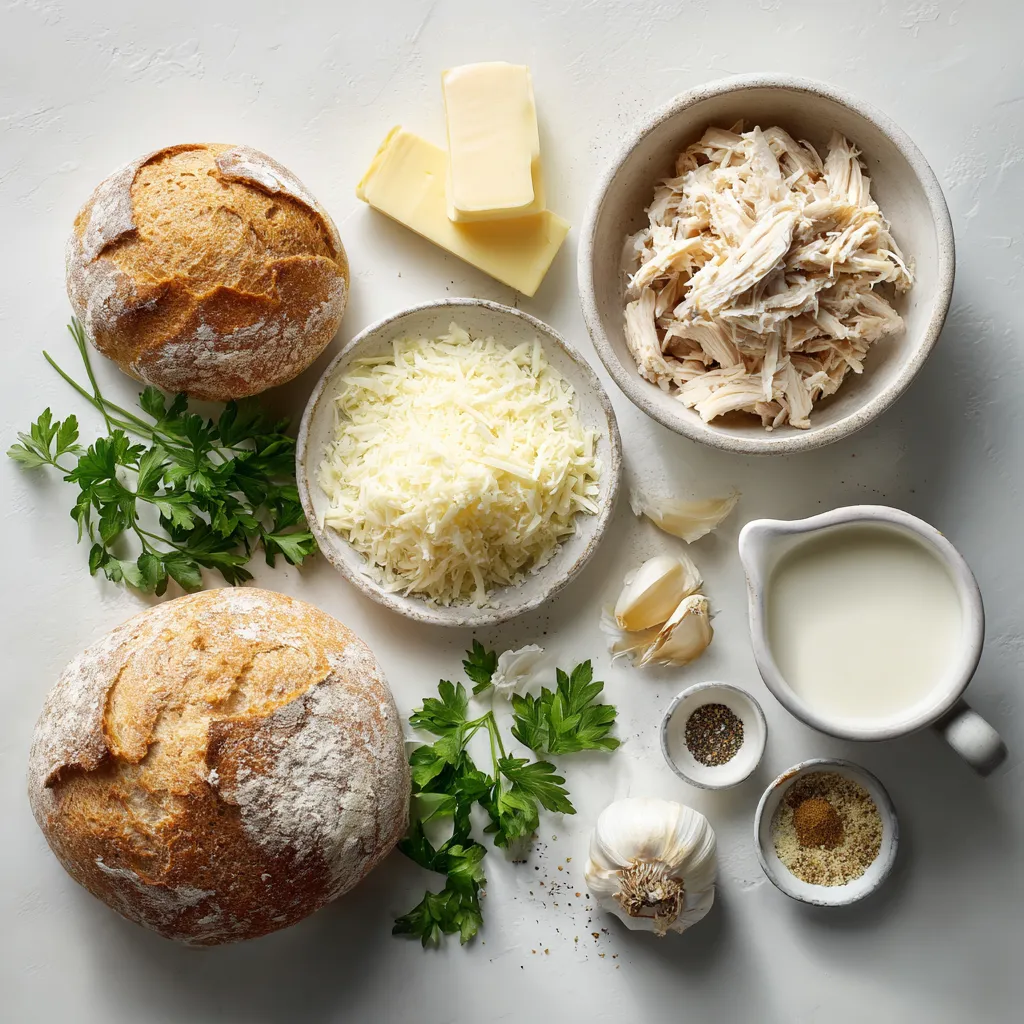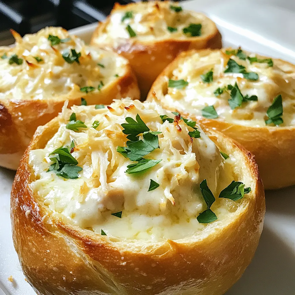 Eine köstliche Kombination aus zerrupftem Hähnchen und cremiger Alfredo-Sauce, serviert in knusprigen Sauerteigbrot-Schalen.
