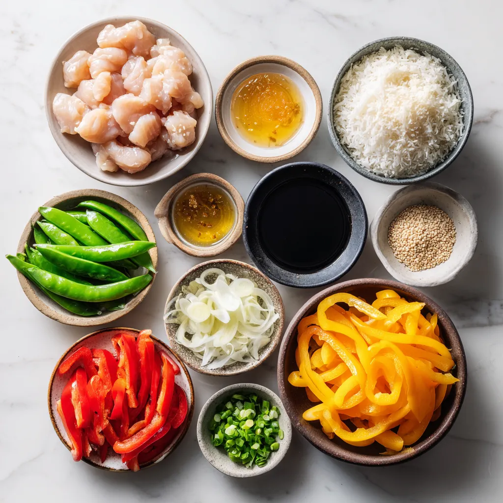 Die Hauptzutaten machen dieses Gericht besonders. Hühnerbrustfilet ist zart und schnell gar. Der Honig bringt Süße und die Sojasauce sorgt für Umami. Paprika und Zuckerschoten fügen Farbe und Crunch hinzu.