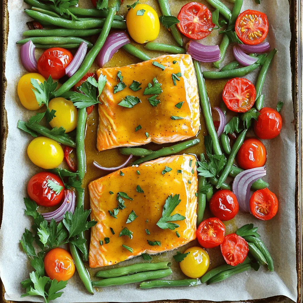 Lege 4 Lachsfilets auf eine Seite des Backblechs. Bestreiche jedes Filet mit der Marinade, bis sie gleichmäßig bedeckt sind. Nimm dann die grünen Bohnen, Kirschtomaten, Paprika und rote Zwiebeln. Arrangiere das Gemüse auf der anderen Seite des Backblechs. Beträufle es mit etwas Olivenöl und würze mit Salz und Pfeffer. Mische alles gut durch, damit die Gewürze gleichmäßig verteilt sind.
