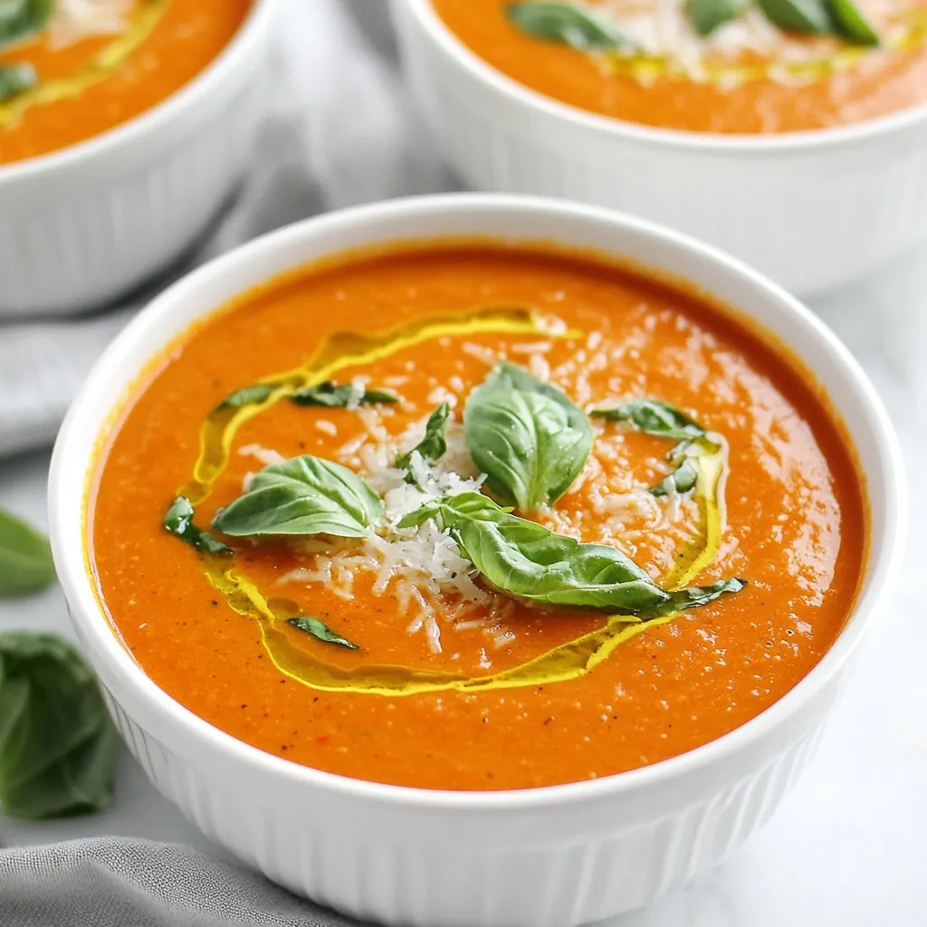 Eine köstliche, cremige Suppe mit Tomaten und frischem Basilikum.