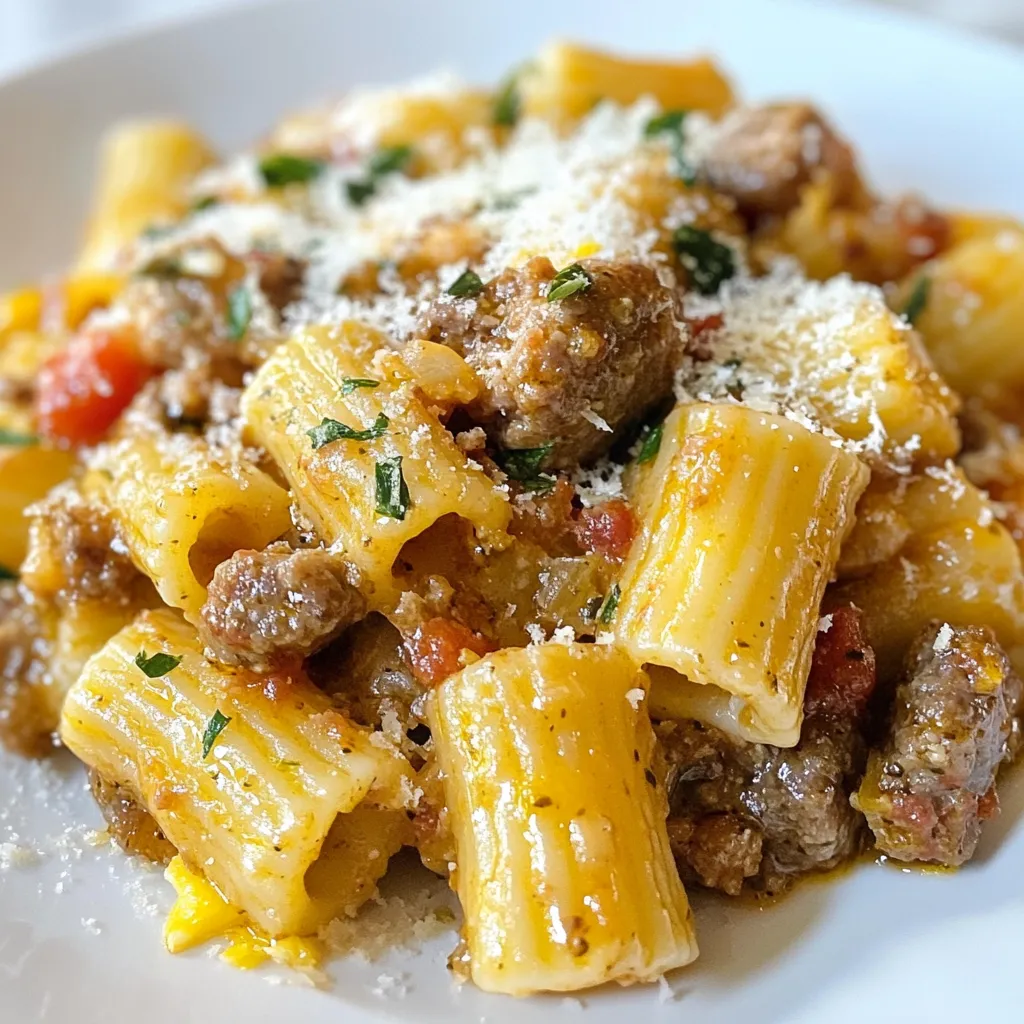 Ein köstliches Pasta-Gericht mit italienischer Wurst, Tomaten und Sahne.