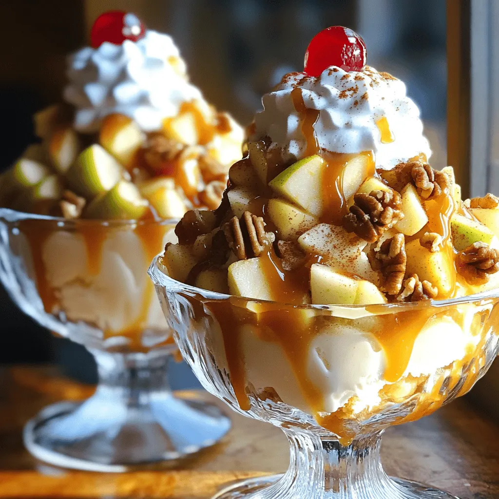Ich nehme Dessertschalen oder Parfaitgläser für meine Sundaes. Ich beginne mit einer großzügigen Portion Vanilleeis. Das Eis bildet die Basis. Dann lege ich die gewürfelten Äpfel über das Eis. Ich streue etwas gemahlenen Zimt darüber. Der Zimt fügt ein warmes Aroma hinzu. Jetzt gieße ich die warme Karamellsauce über die Äpfel. Ich achte darauf, dass die Sauce gut verteilt ist. Wenn ich mag, füge ich gehackte Nüsse hinzu. Diese geben einen schönen Crunch. Ich kröne das Sundae mit einem weiteren Eisball, viel Schlagsahne und einer Maraschino-Kirsche. So sieht es noch besser aus!