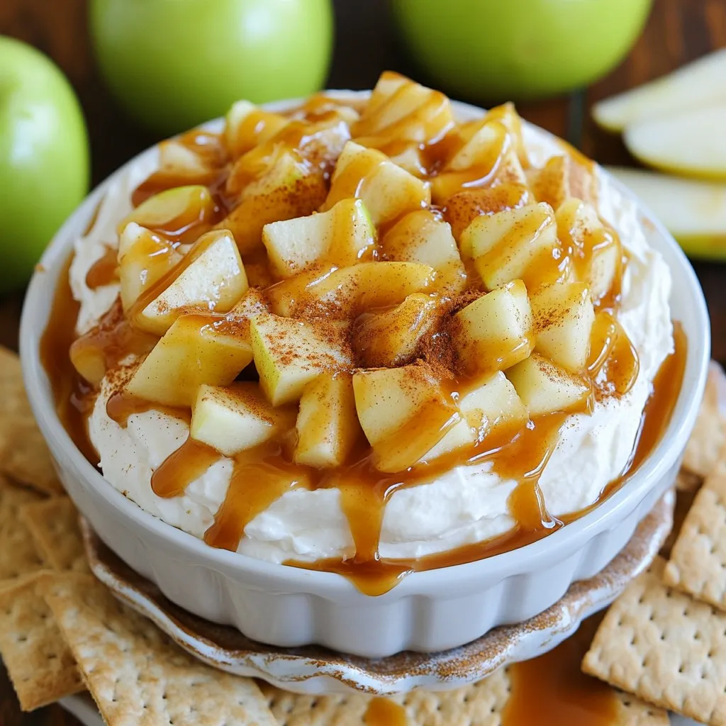 Jetzt bauen wir den Dip auf. Nehmen Sie eine schöne Servierschüssel. Verteilen Sie die Frischkäse-Mischung gleichmäßig auf dem Boden. Glätten Sie die Oberfläche mit einem Spatel. Gießen Sie dann die Karamellsauce über die Frischkäse-Schicht. Lassen Sie die Sauce an den Seiten heruntertropfen. Danach legen Sie die gewürzten Äpfel gleichmäßig darauf. Wenn Sie möchten, träufeln Sie etwas mehr Karamellsauce über die Äpfel. Servieren Sie den Dip sofort. Dazu passen Graham Cracker, Apfelscheiben oder Vanille-Waffeln perfekt.