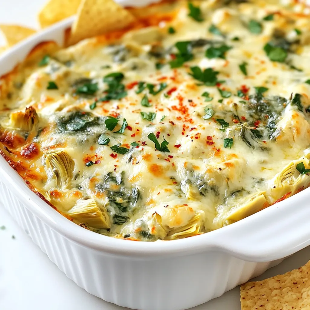 Ein cremiger und köstlicher Dip mit Spinat, Artischocken und Käse, perfekt zum Dippen.