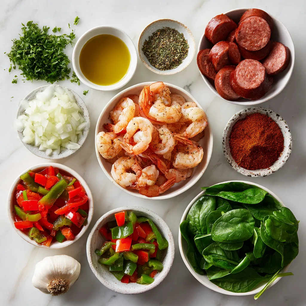 Diese Zutaten bringen Farbe und Geschmack in dein Gericht. Die Garnelen sind zart und voller Geschmack. Die Wurst gibt der Pfanne eine herzhafte Note. Paprika und Zwiebeln sorgen für Crunch und Frische.