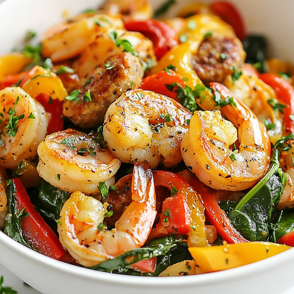 Eine köstliche und gesunde Pfanne mit Garnelen und Wurst, ideal für eine ketogene Ernährung.