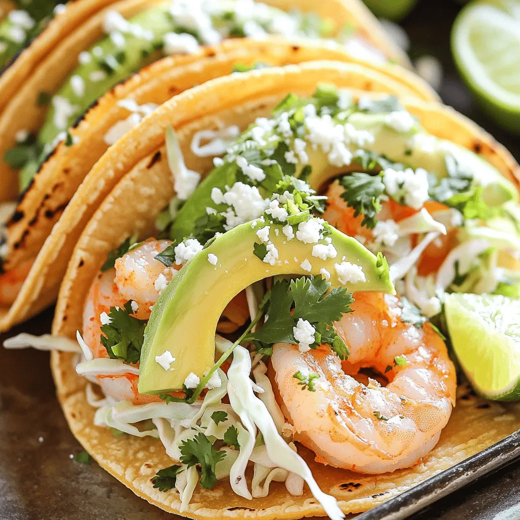 Jetzt kommt der spaßige Teil: die Tacos zusammenstellen! Nimm eine Tortilla und lege eine gute Menge gehackten Kohl darauf. Darauf kommen die Koriander-Limetten-Garnelen. Füge einige Avocadoscheiben als Topping hinzu. Wenn du möchtest, bestreue die Tacos mit Cotija-Käse. Serviere sie mit Limettenspalten für einen frischen Kick.