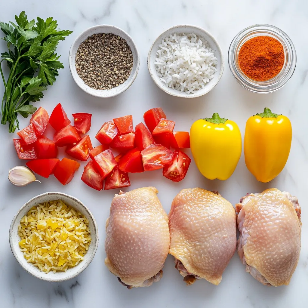Ich liebe es, frische und einfache Zutaten zu nutzen. Die Hähnchenschenkel geben viel Geschmack. Langkornreis ist perfekt, um die Brühe aufzusaugen. Das Gemüse bringt Farbe und Frische ins Gericht. Zwiebeln und Knoblauch sind die Basis für einen tollen Geschmack. Die Tomaten und Paprika sorgen für Saftigkeit und Textur. Kalamata-Oliven bringen eine salzige Note.