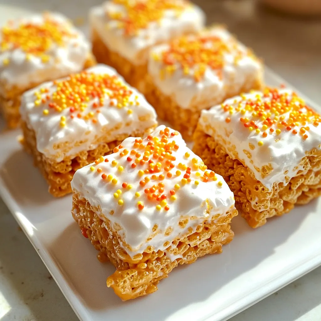 Optional können Sie die Treats mit orangefarbenen und gelben Streuseln dekorieren. Lassen Sie die Leckereien für mindestens 30 Minuten abkühlen. Schneiden Sie sie dann in Quadrate oder Rechtecke.