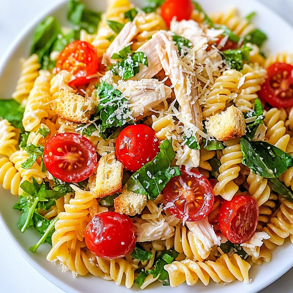Ein cremiger und erfrischender Pasta-Salat mit Hähnchen, Romaine-Salat und Caesar-Dressing.