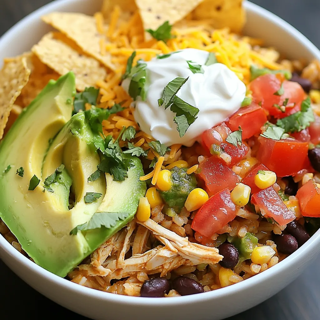 Ich füge Hühnerbrühe hinzu, um alles saftig zu halten. Der Saft der Limette bringt Frische. Die Garnierungen machen die Bowl besonders. Frischer Koriander, Avocadoscheiben, Sauerrahm und geriebener Käse sind perfekt zum Dekorieren.