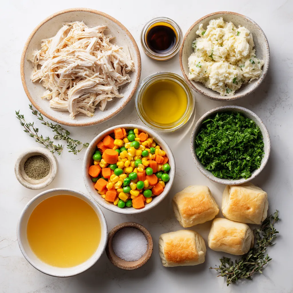 Die Hauptzutaten sind einfach und leicht zu finden. Gekochtes Hähnchen gibt dem Auflauf viel Geschmack. Wenn du kein Hähnchen hast, kannst du auch Reste verwenden. Gefrorenes gemischtes Gemüse macht die Zubereitung schnell. Es bringt Farbe und Nährstoffe in das Gericht. Hühnerrahmsuppe und Hühnerbrühe sorgen für eine cremige Basis. Diese Flüssigkeiten machen den Auflauf saftig und lecker.