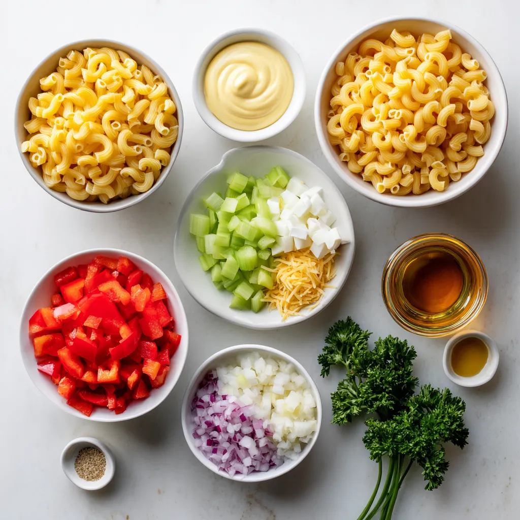 Diese Hauptzutaten geben dem Salat seine cremige Basis. Die Makkaroni machen ihn sättigend und die Mayonnaise sorgt für eine tolle Textur. Dijon-Senf bringt einen feinen Geschmack ins Spiel.